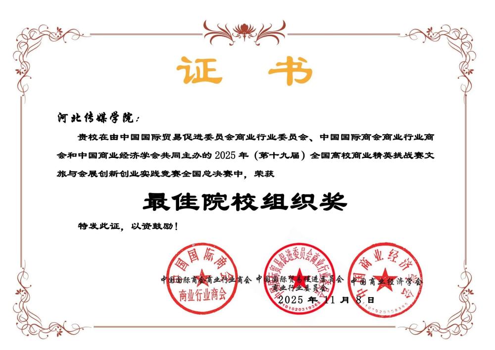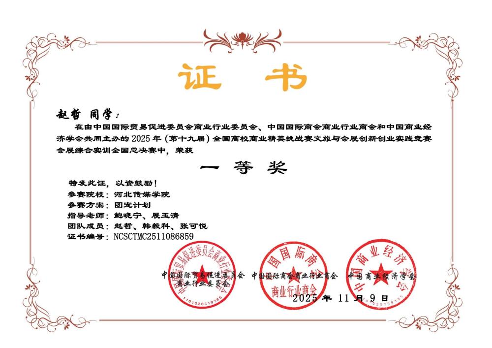 全国高校商业精英挑战赛是我国高等商科教育领域的重要赛事,已连续多年入选全国普通高校大学生竞赛排行榜。本届竞赛吸引了全国数百所高校、上千支队伍同台竞技,竞争异常激烈。在层层选拔与激烈角逐中,我校参赛团队以创新的策划方案、扎实的专业功底和出色的现场表现赢得评委认可。其中,由2023级会展经济与管理专业赵哲等同学完成的《团宠计划》,凭借对校园人文关怀的深入理解和巧妙构思,荣获会展综合实训竞赛全国一等奖。